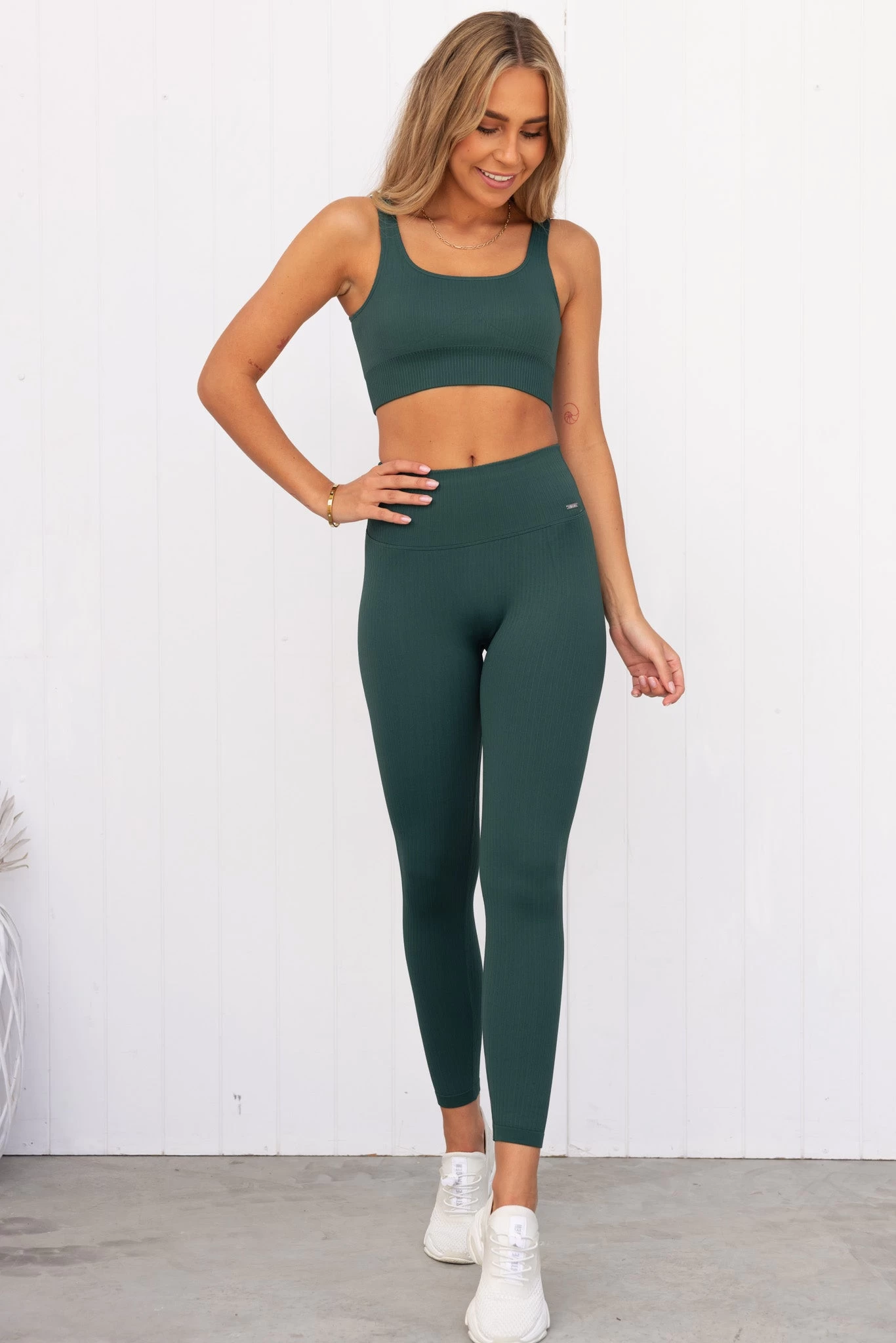 Complete the look with the Pine Green Ribbed Seamless Tights