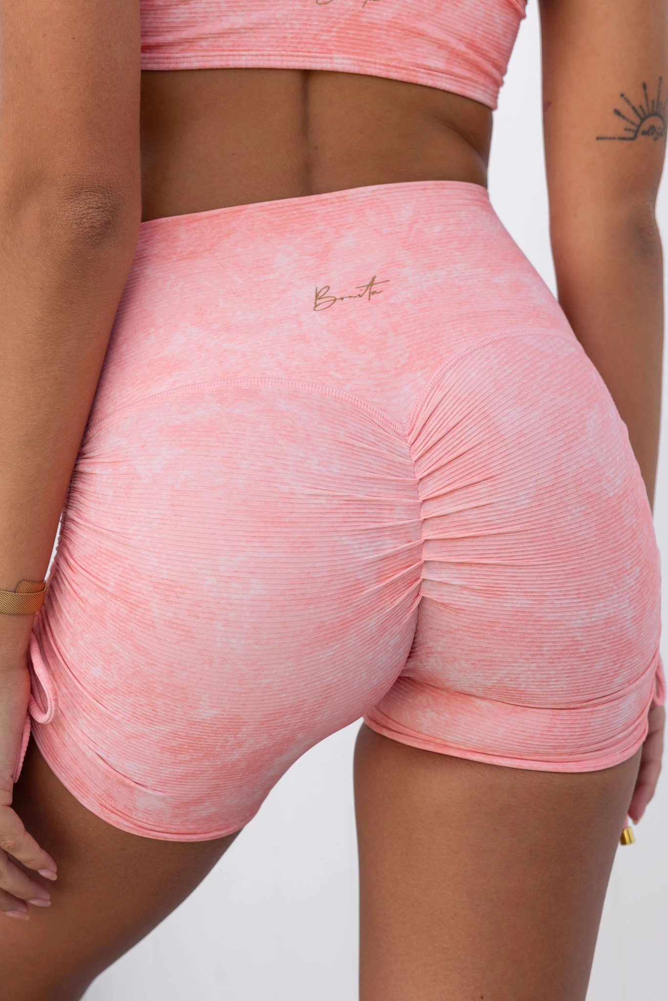Your next workout just got a whole lot cuter! We are obsessing over the figure flattering high waist band that is designed to cinch in your waist teamed with a supportive ribbed performance fabric for a ‘snatched’ fit. We also love the fresh Peach hue (perfect for Summer) and the booty enhancing scrunch bum detail. Great for various activities including weight training, yoga, pilates and running errands. Due to the light colour of the fabric we recommend wearing nude seamless underwear to reduce show through. Style runs small, if you are between sizes we recommend sizing up. Â