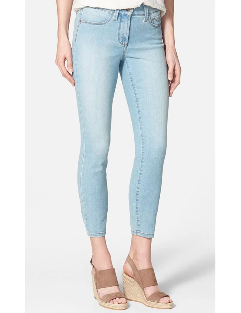NYDJ Angie Super Skinny Ankle Pants in a light blue Burley Wash with plain back pockets, zip-fly, button closure with a ankle-grazing length for versatile wear for summer.