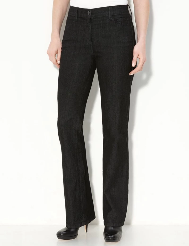 NYDJ Barbara stylish black resin wash modern bootcut jeans in light-weight denim that caresses your curves and lifts your spirits. Five-pocket styling, button-closure with tonal stitching and floral back pocket design.