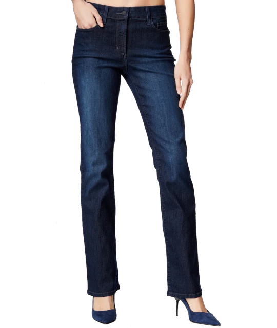 NYDJ Billie Mini Bootcut Jeans featuring a narrower boot-leg opening in a blue Burbank Wash not only ultra comfortable but also incredibly flattering. Exclusive lift-tuck technology helps flatten the tummy and lift the rear with five-pocket styling, zip-fly and button closure.