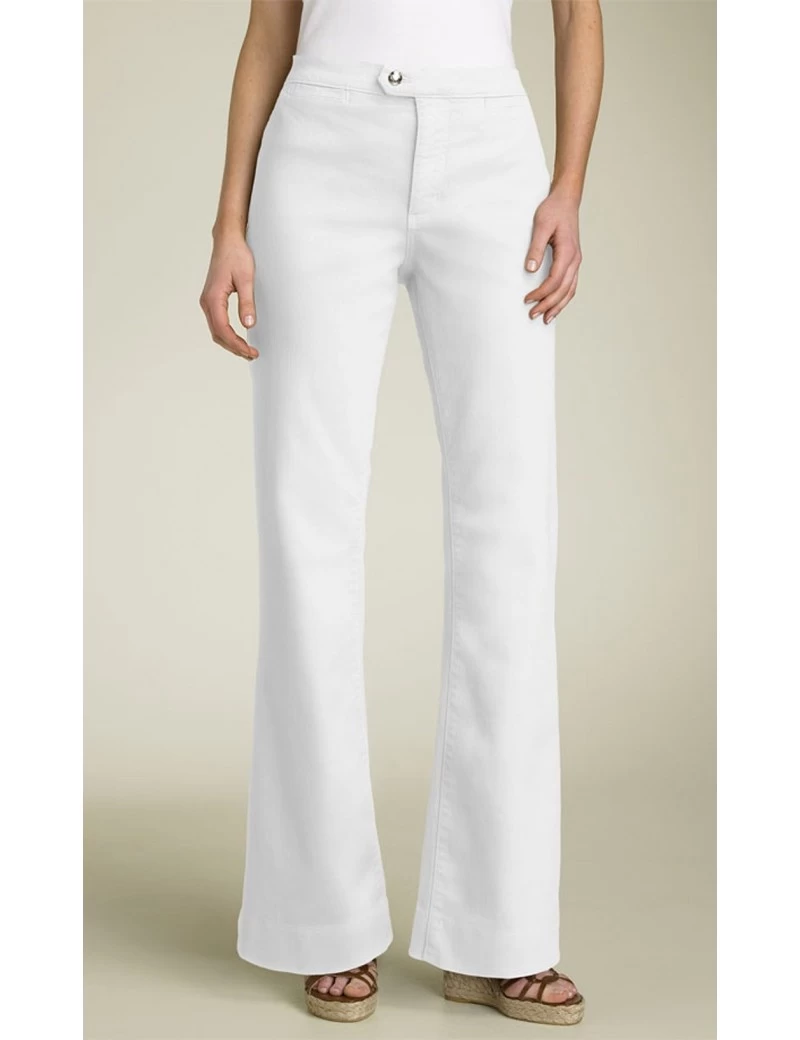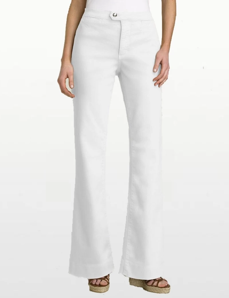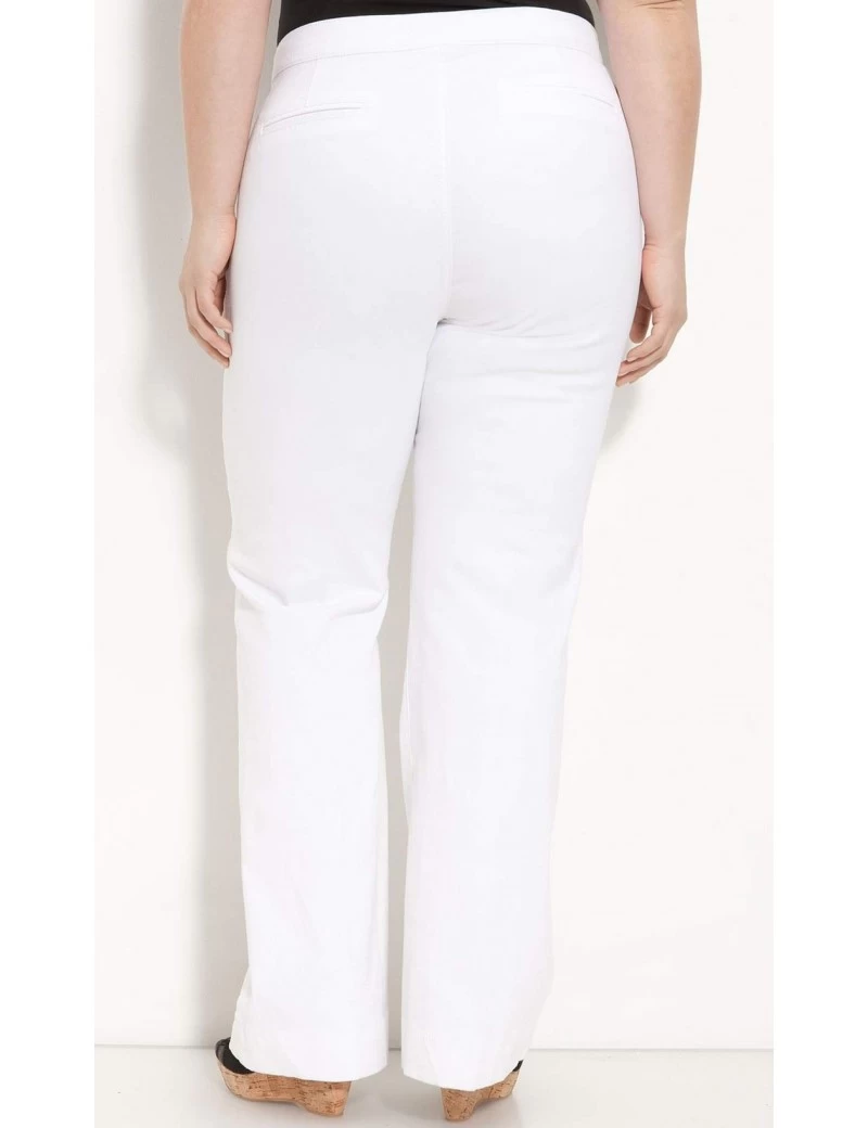 NYDJ Bootcut all-occasion white trouser style jeans with tab front & zip fly. Inner criss-cross panel flattens tummy, lifts buttocks, eliminates love handles, and makes you look a size smaller instantly.