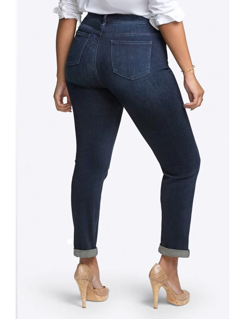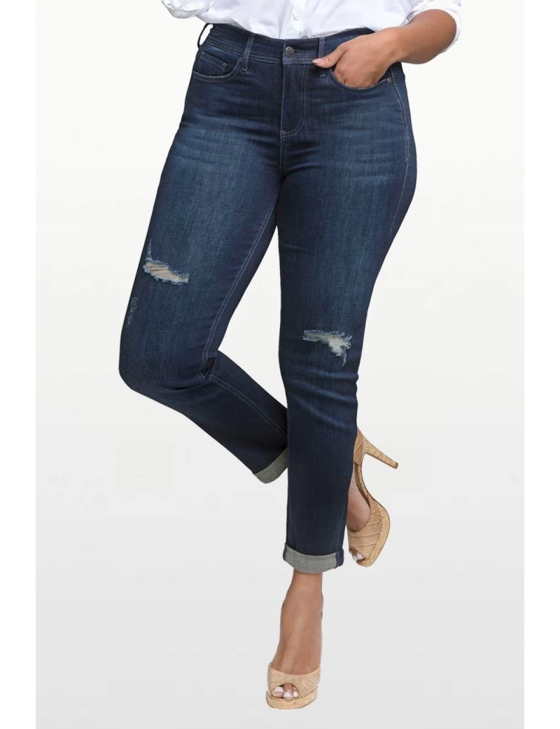 This Shape Slim Straight Jeans In Curves 360 Denim is designed with our innovative, 360-degree, interior panel to slim, support and lift from the front to the back side. Made of our soft and stretchy Curves 360 denim, this dark-indigo jean molds perfectly to every curve. Features subtle hand sanding and whiskering, destruction on the knee and thigh, and a rolled hem for a well-worn look with some boyfriend-inspired charm.