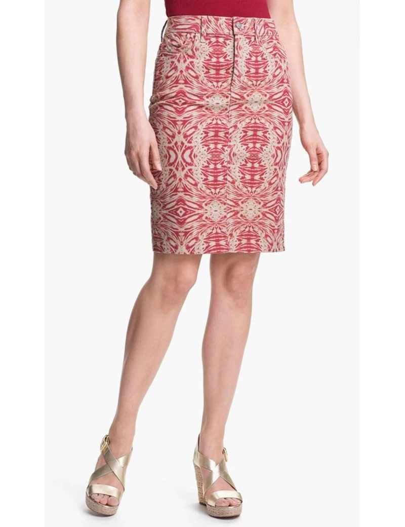 NYDJ Red & Tan Tribal Print skirt in twill with revolutionary criss-cross panel keeps your tummy in control and makes you look a full size smaller, instantly.