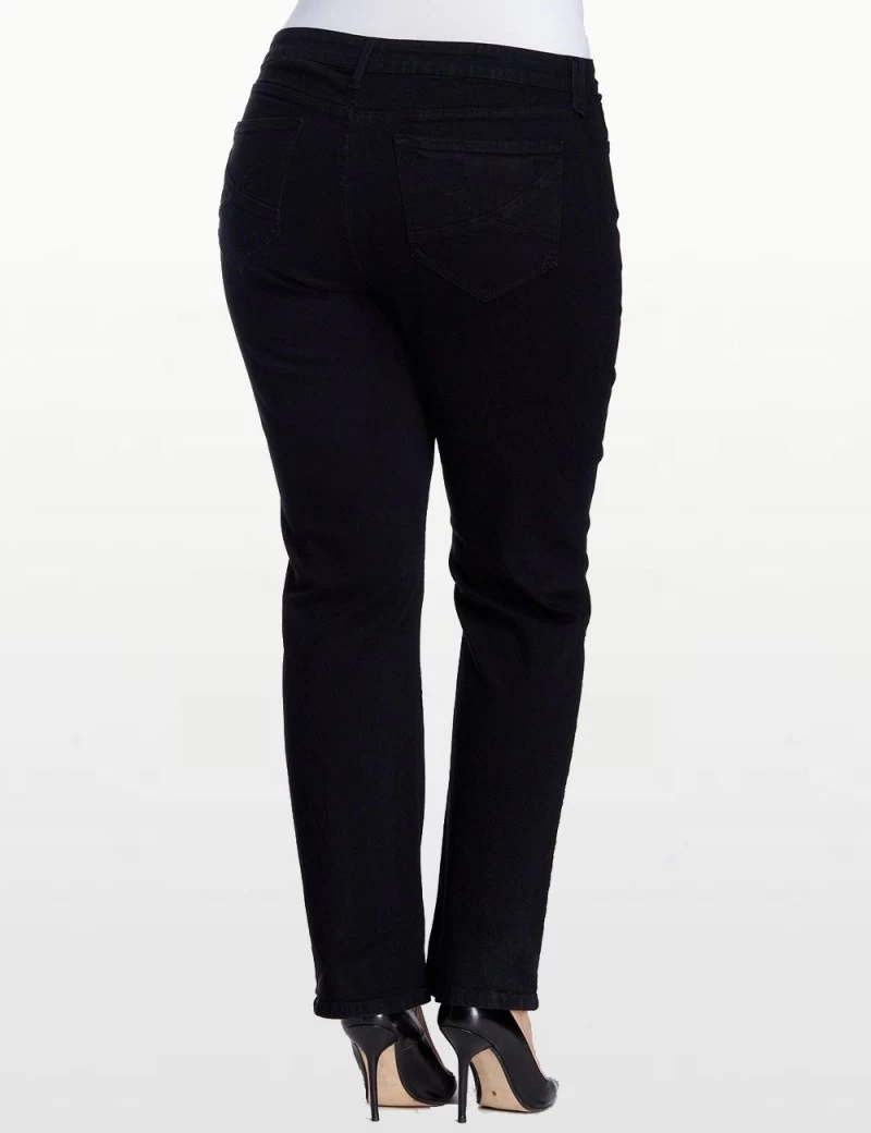 NYDJ Hayden Straight Leg Jeans in super soft black denim with a few eye-catching details, like double belt loops and criss-cross back pocket stitching with 5 pocket styling, zip-fly, button closure.Â