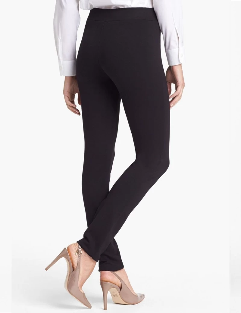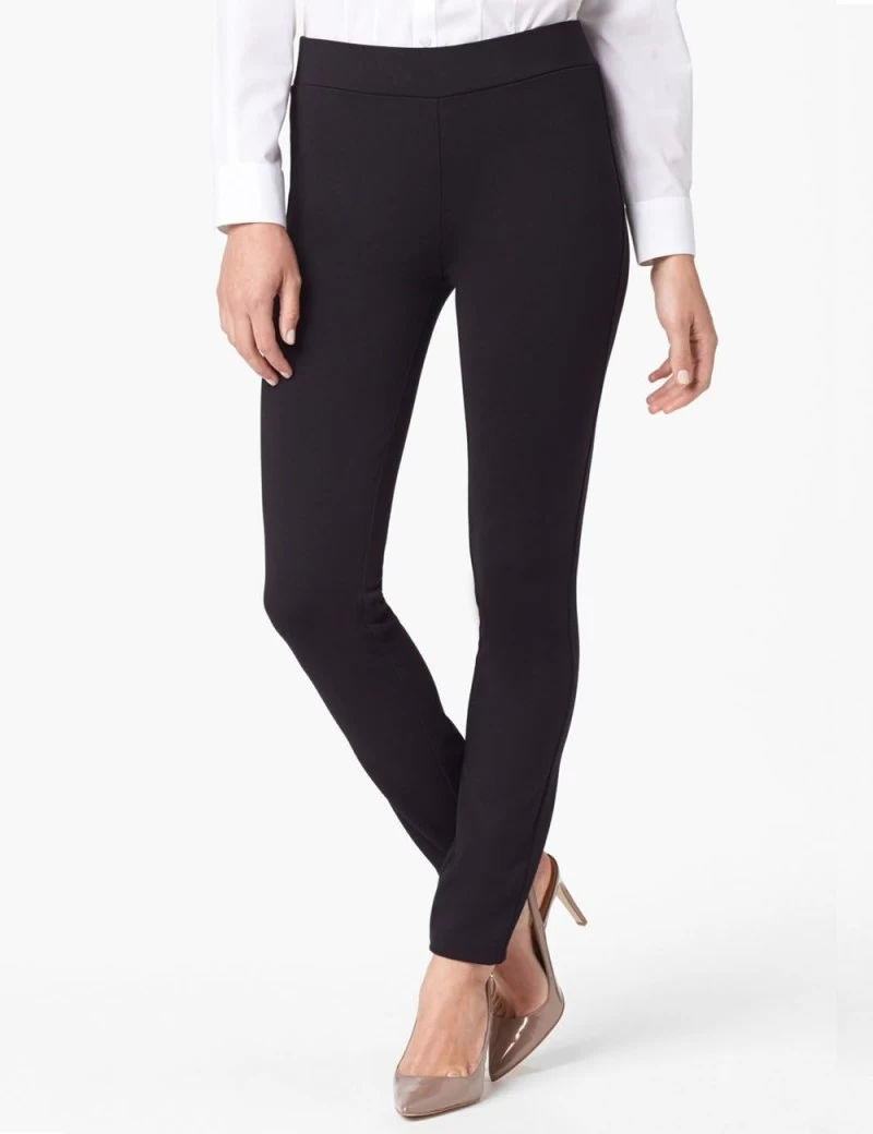Sleek Black NYDJ Jodie pull-on pants in a super-stretchy ponte knit with elastic waist and exclusive lift-tuck technology helps flatten the tummy and lift the rear