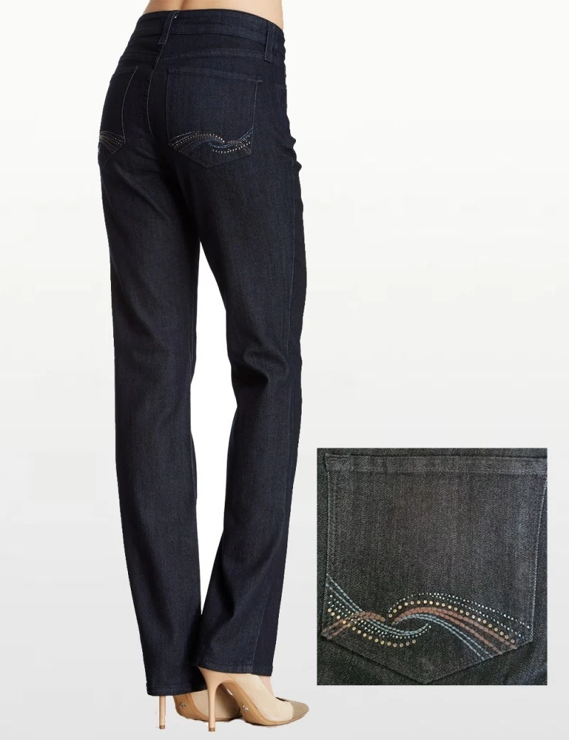 Look and feel absolutely fabulous in a pair of Not Your Daughter’s Jeans. NYDJ Embellished Marilyn Straight Leg Jean in Dark Wash with Embellished Back Pockets. Premium lightweight denim, five pocket styling and NYDJ slimming fit.