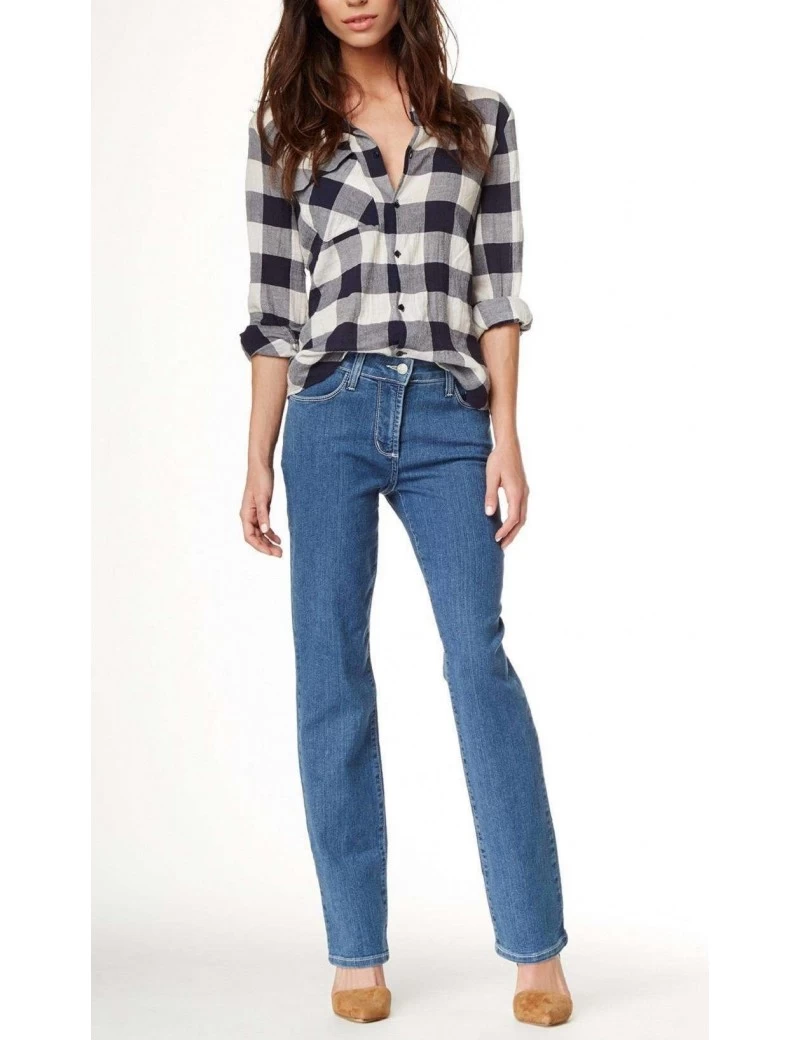 NYDJ Marilyn Straight Leg Jean in Maryland Wash with Embellished Back Pockets. Premium lightweight denim, five pocket styling and NYDJ slimming fit that makes you look a full size smaller, instantly.