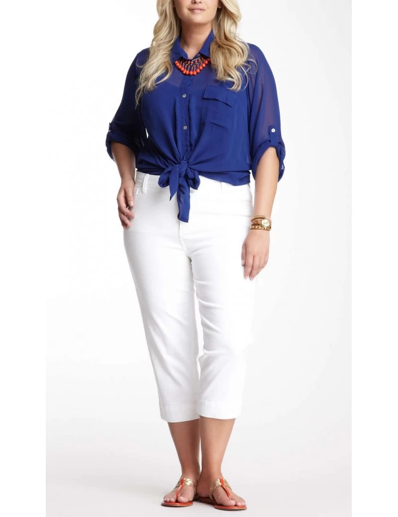 NYDJ Plus Size White Nicole straight leg cropped length stretch-denim capri’s designed with exclusive lift-tuck technology to help flatten the tummy and lift the rear.
