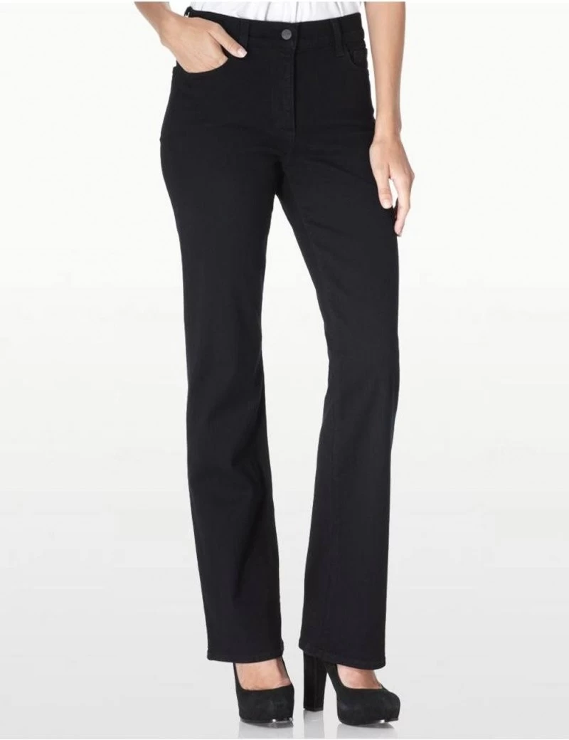 The original NYDJ Black Sarah Classic Bootcut Jeans in super soft denim. These jeans are cut straight through the hips and thighs with a boot cut opening of 20″. Five-pocket styling, button closure, plain pockets and NYDJ’s signature slimming fit.