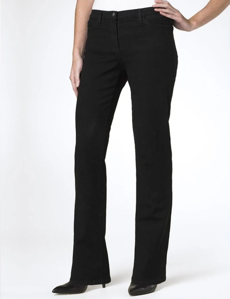 Petite NYDJ Black Sarah Classic Bootcut Jeans in super soft denim with a 29.5 inch inseam, five-pocket styling, button closure, plain pockets and NYDJ’s signature slimming fit.These jeans are cut straight through the hips and thighs with a boot cut opening.