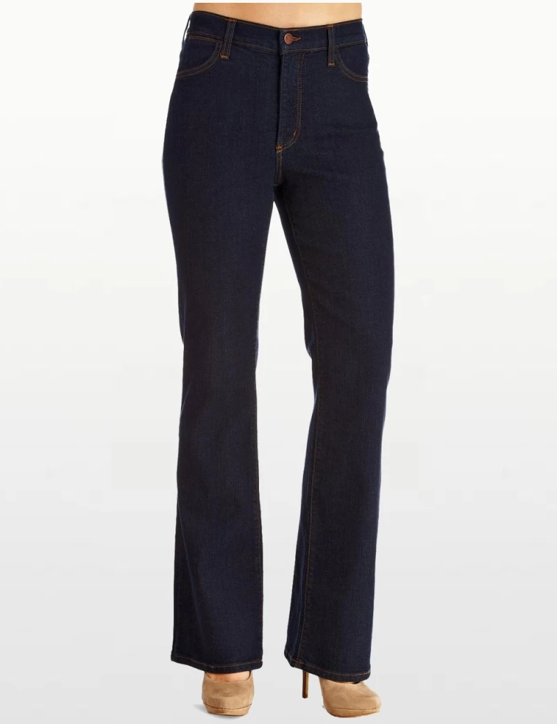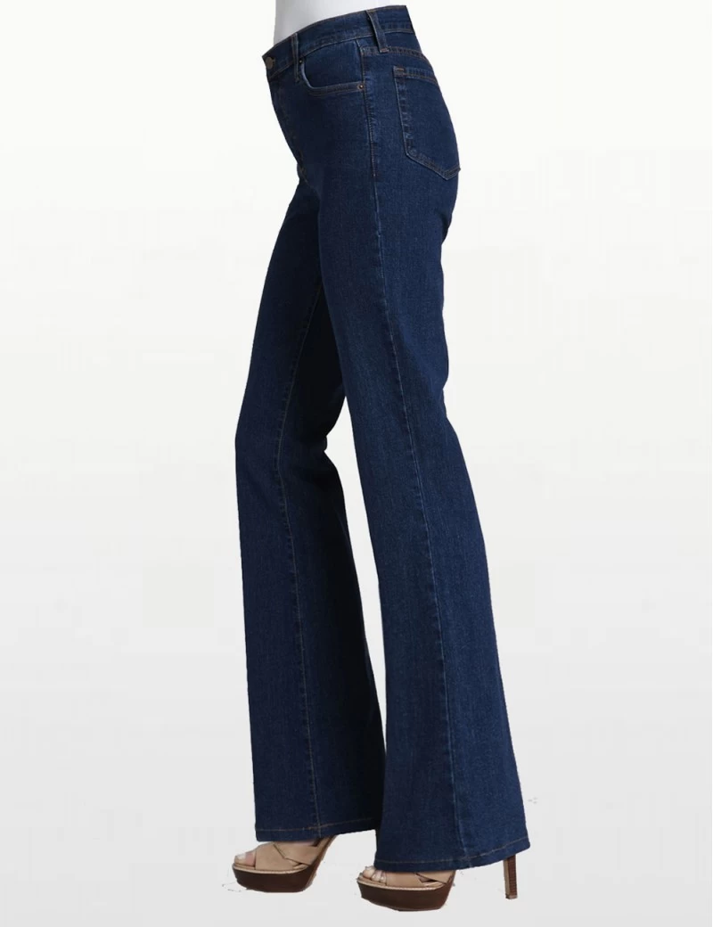 NYDJ Sarah Original Bootcut Jeans in Dark Blue Midnight Wash denim. These jeans are cut straight through the hips and thighs with a boot cut opening of 20″. Five-pocket styling, button closure, plain pockets and NYDJ’s signature slimming fit.