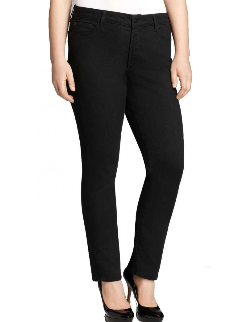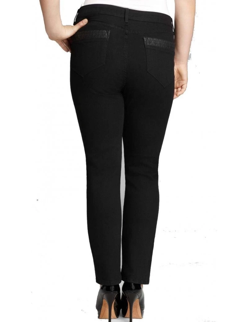 You just can’t go wrong with black denim. Not Your Daughters Jeans Sheri Skinny Leg Jeans with Decorative Leather Trim on Back Pockets not only ultra comfortable but also incredibly flattering. Features five-pocket styling, zip-fly, button closure with a slightly shorter inseam that looks great with flats, heels, or boots.Â