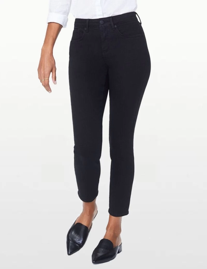 NYDJ’s Black Skinny Ankle Jeans with exclusive Lift Tuck® Technology flattens your front, using a proprietary slimming panel with a patented criss-cross design. Dress them up or dress them down—the slim fit adds an easy edge to your look. Features classic five-pocket styling, zip fly and button closure.