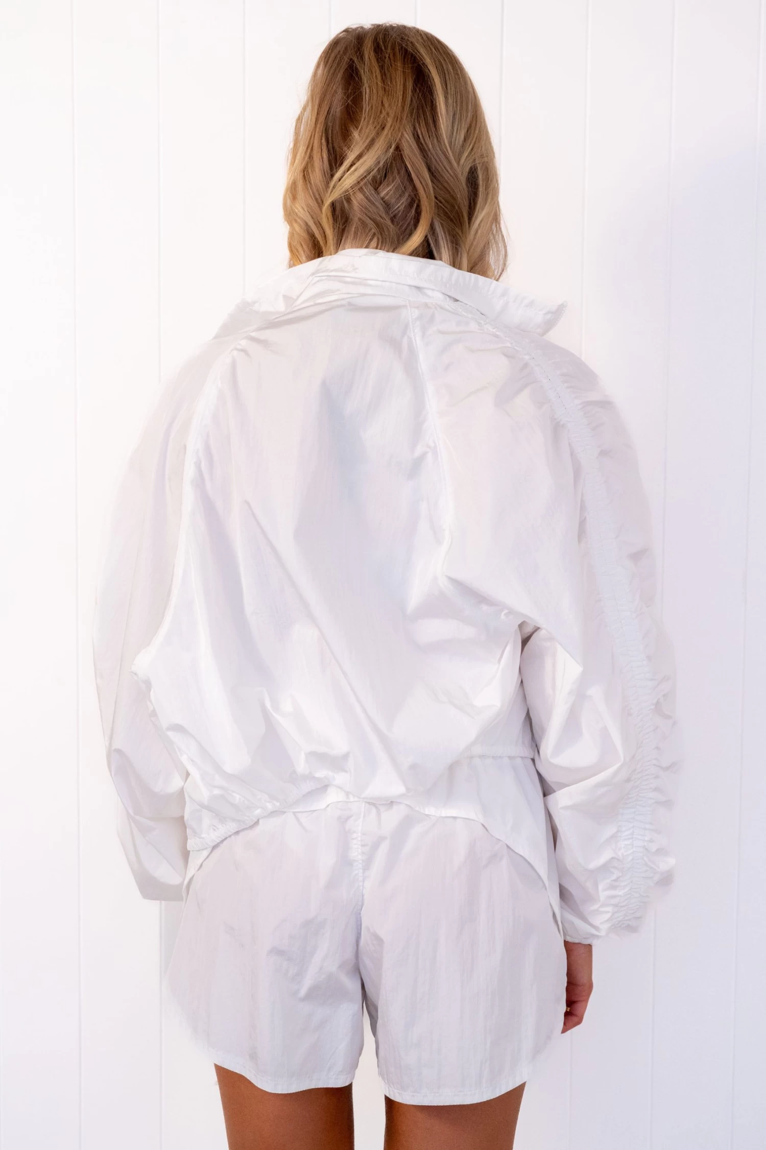 Fun yet functional is what the Parachute Jacket is all about! A light weight style with an adjustable drawstring waistband, full zip closure and pockets. We’re also obsessed with the ruching detail on the sleeves and the fresh white hue.Â