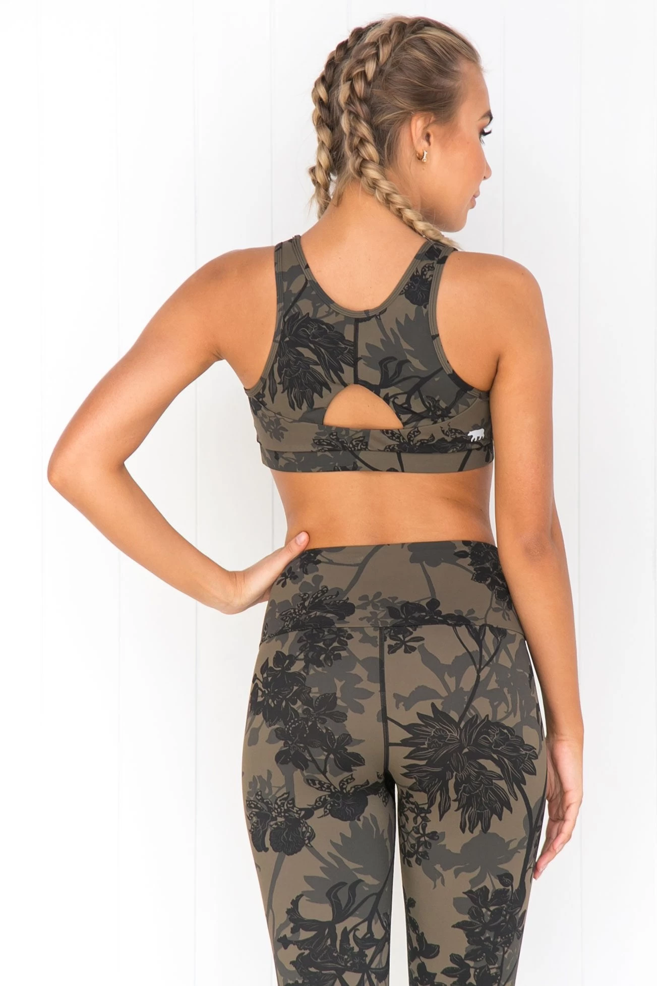 Get ready to stop traffic and turn heads in this stylish and supportive Crop. Features include a stunning olive and black print, sporty cut out detail and more coverage for more support. Offering medium support, this crop is great for gym and your low to medium impact workouts.
