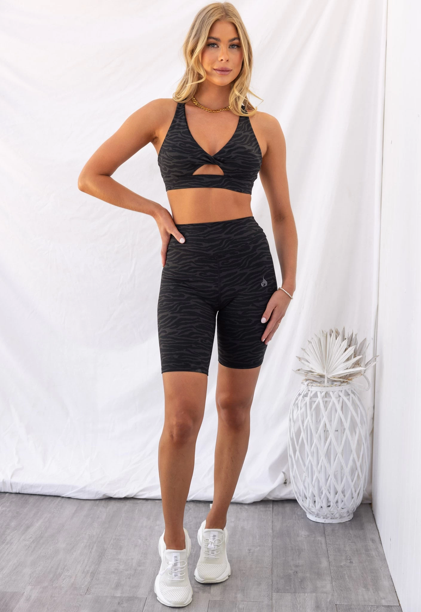 Look and feel fierce in the Twist Sports Bra! This flattering crop features a cute twist detail at the front teamed with a plush, soft-to-touch performance fabric and fierce, all over zebra print. We are obsessed with the striking back detail and love the option of removable padding for a customisable fit. Offering soft to medium support, this style is perfect for various activities including running errands, cardio, weight training, yoga and pilates.